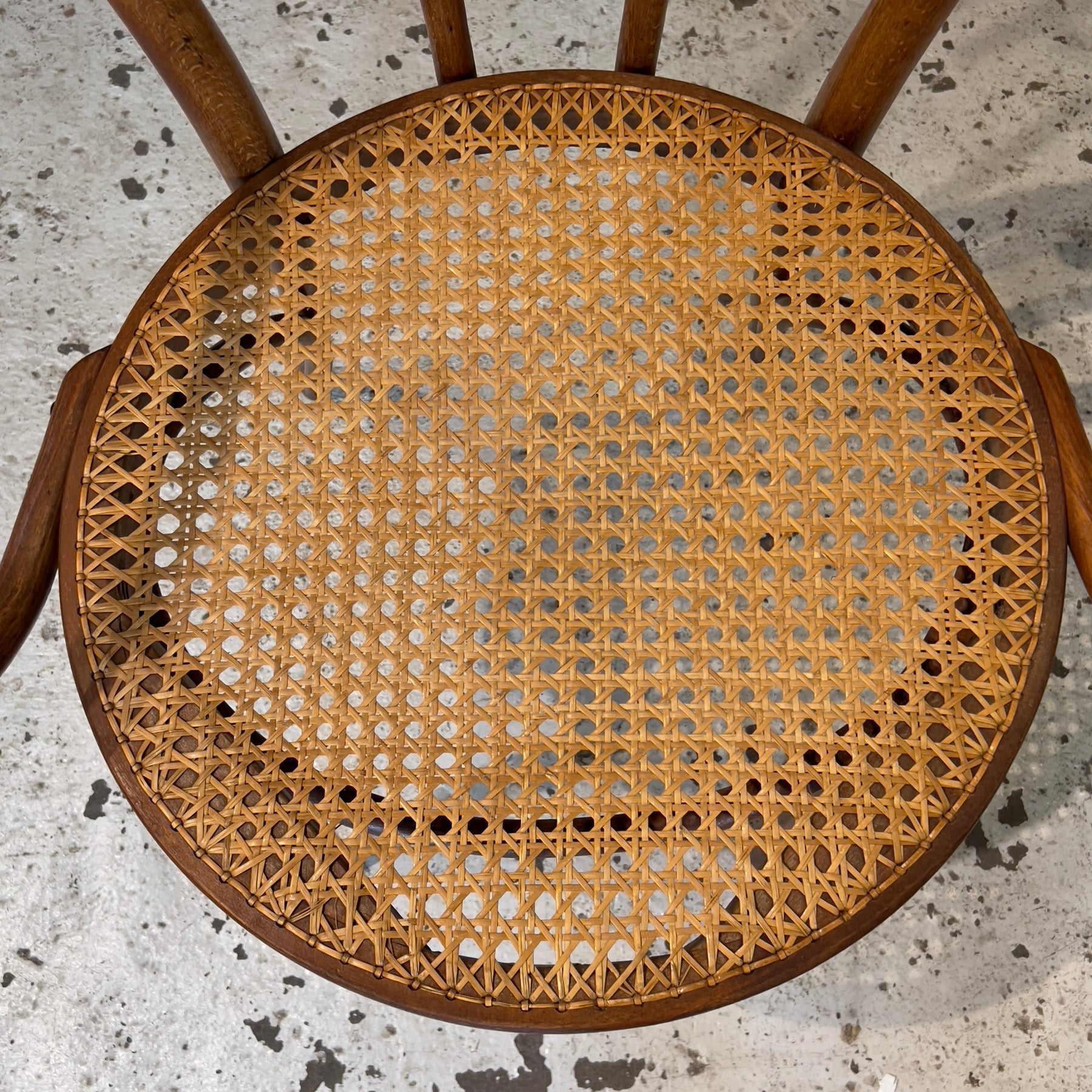 Beautiful antique Romanian-made Thonet bentwood armchair with perfect caning. Two available. Both are sturdy and clean, but do exhibit wear to the finish, especially the arms and tops of the backrests.